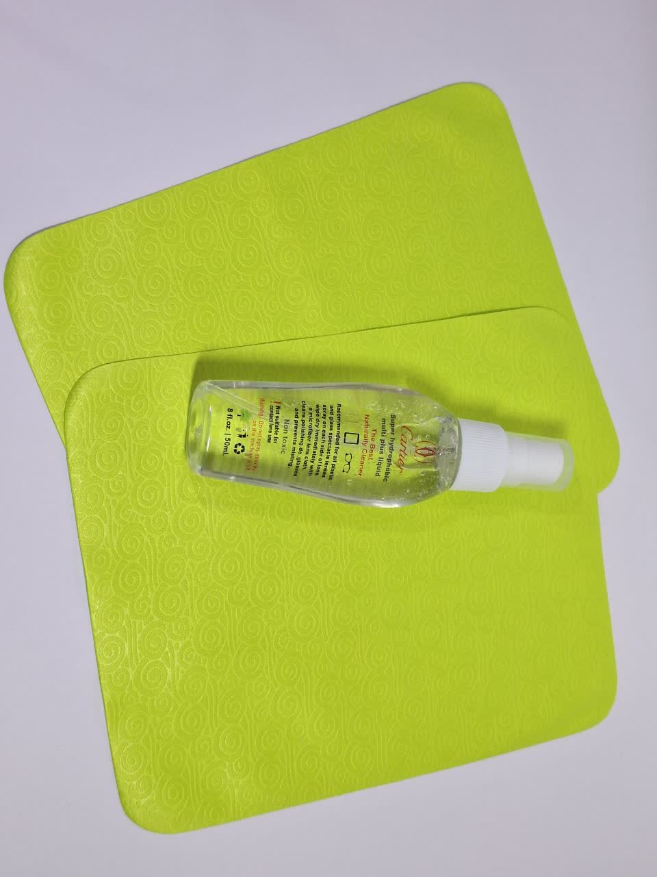 برای همه لنزهای عینک پلاستیکی و شیشهای توصیه میشود. روی هر دو طرف لنز اسپری کنید. بلافاصله با یک پارچه میکروفایبر مخصوص لنز خشک کنید. عینک را تمیز، و براق میکند و از بخار گرفتن جلوگیری میکند.